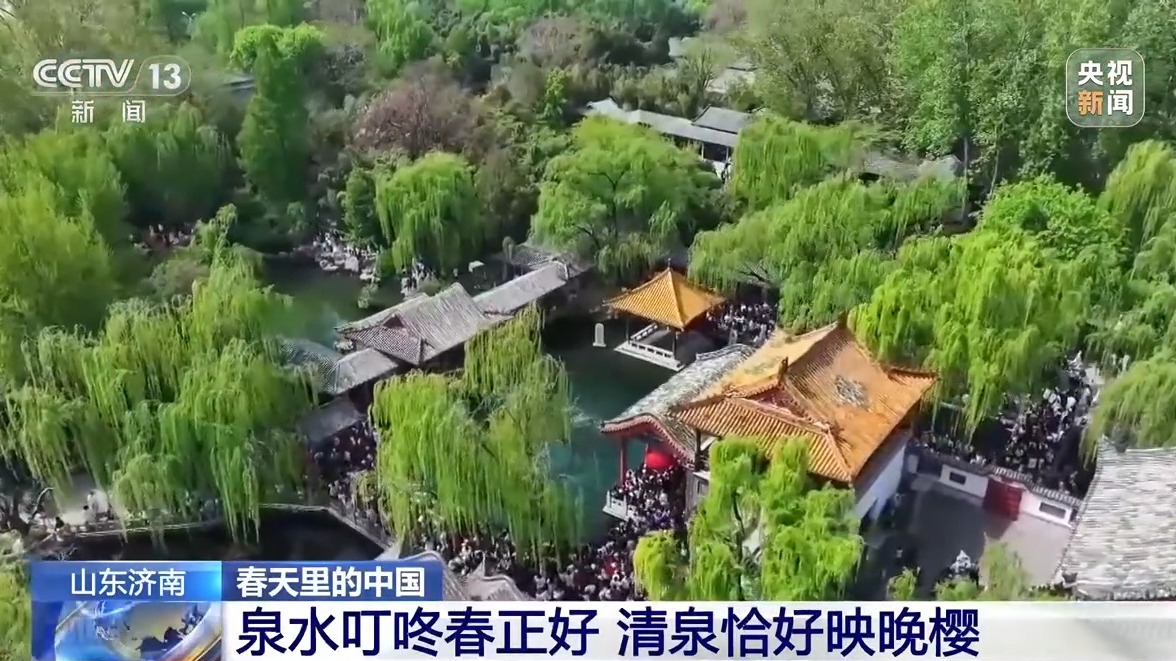 在山东济南,游客听泉、赏花、品春色,感受独具特色的婉约韵味。