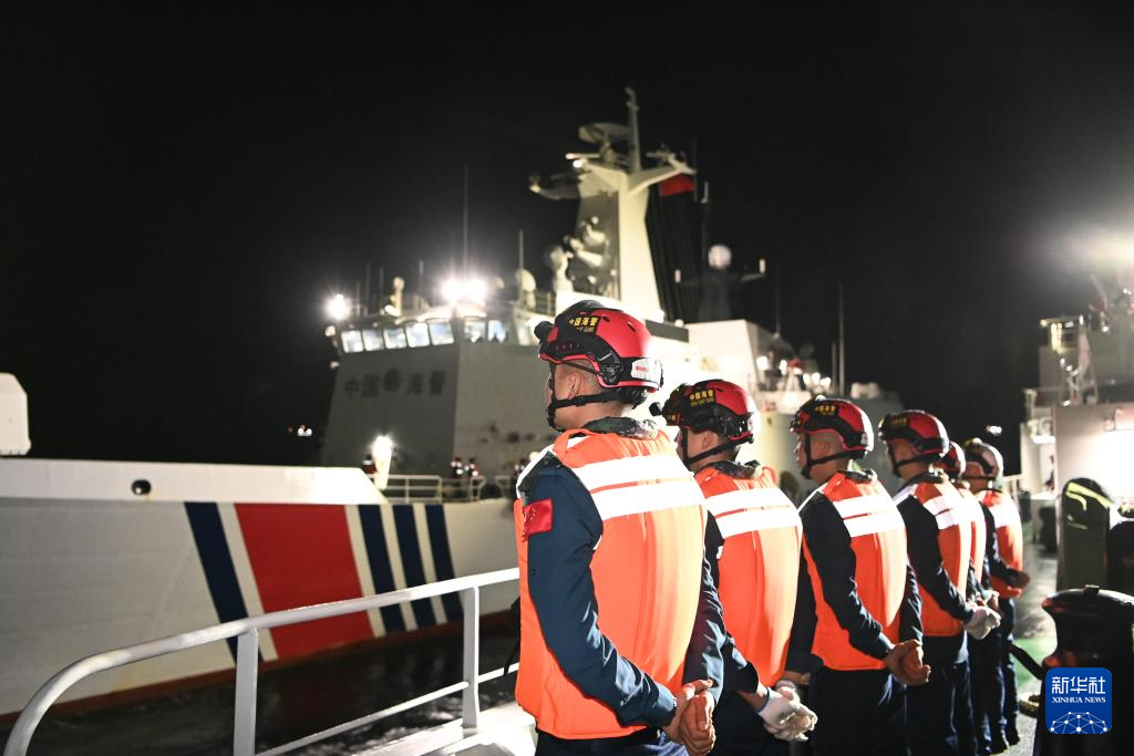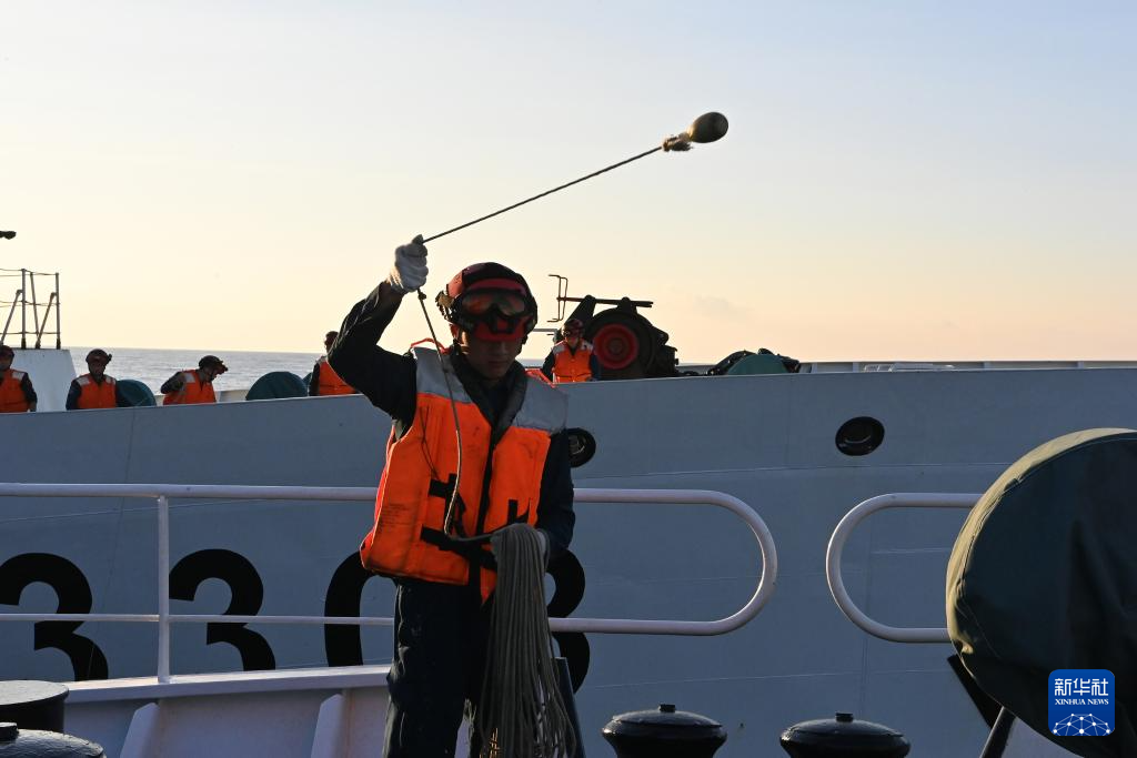 3月1日,中国海警万山舰执法员撇缆,辅助舰艇并靠。
