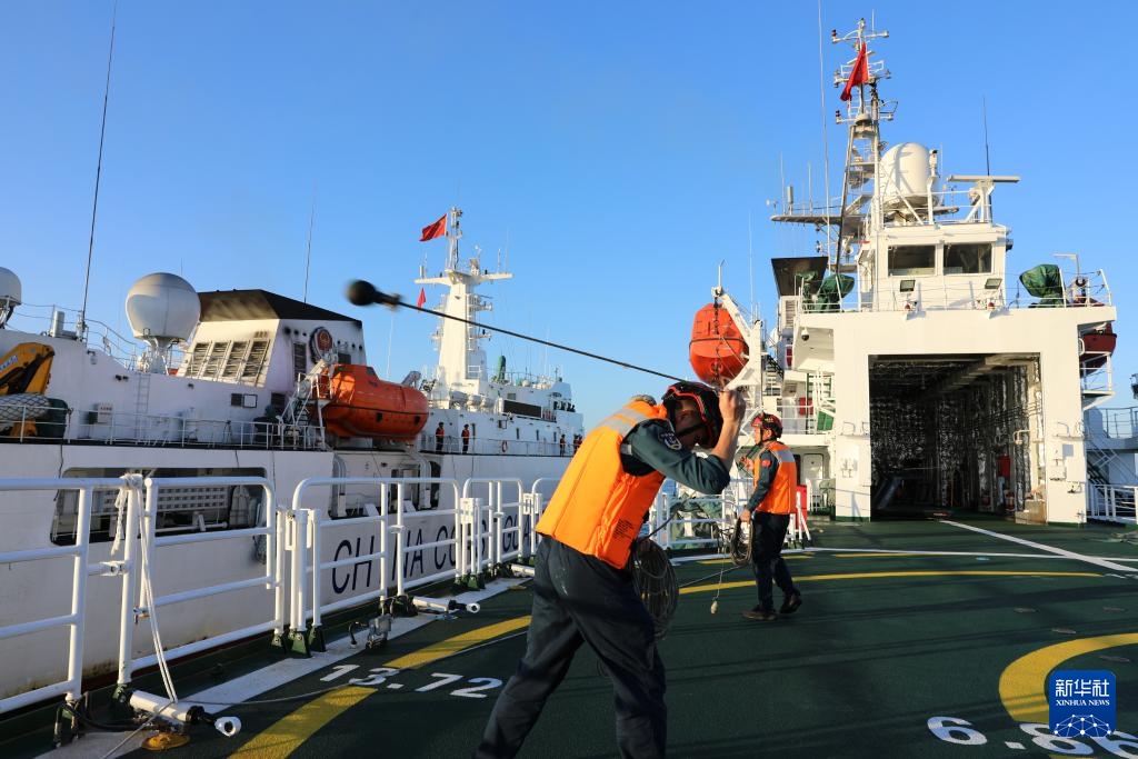 3月1日,中国海警万山舰与海陵舰并靠时,万山舰执法员开展帆缆作业。