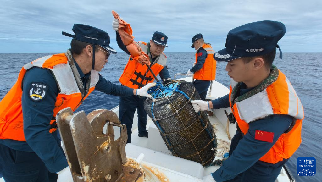 2月14日,中国海警万山舰执法员在黄岩岛附近海域打捞起集鱼装置。
