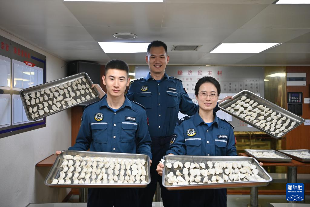 2月7日,中国海警万山舰执法员展示包好的饺子。