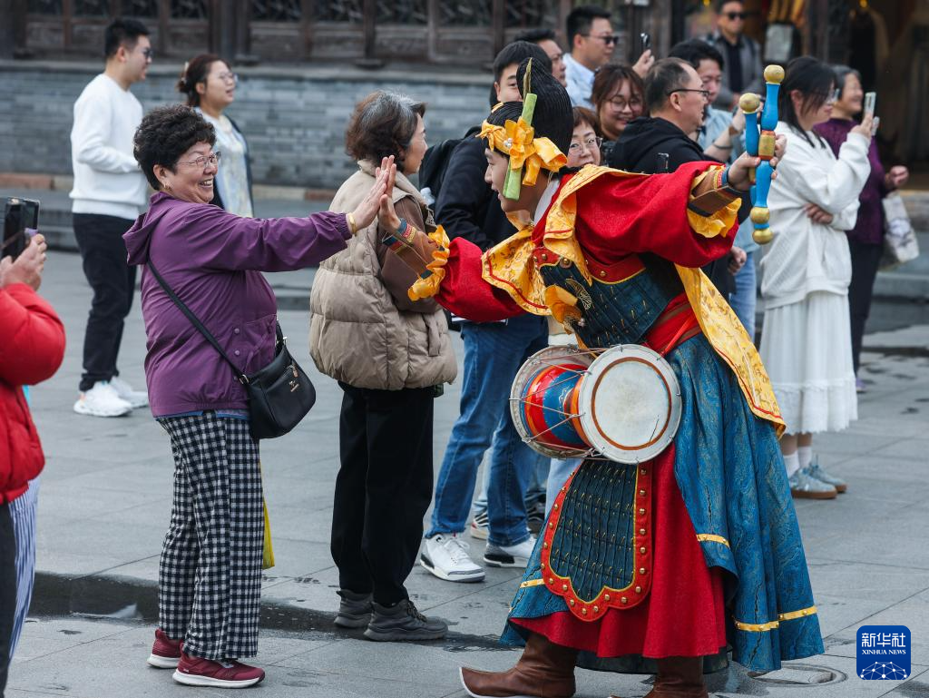 4月1日,参加乌镇香市蚕花盛会的巡游演员在古镇的街市上与游客互动。