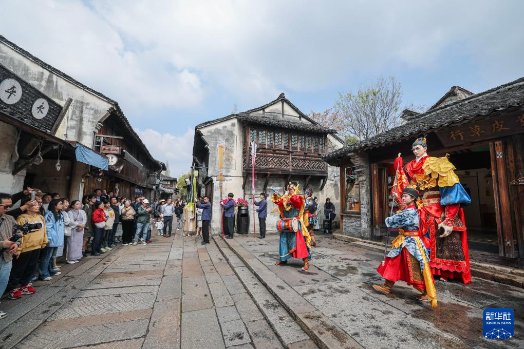 4月1日,乌镇香市蚕花盛会的巡游队伍在古镇的街市上巡游表演。