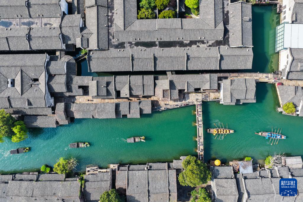 4月1日,乌镇香市蚕花盛会的船队在河道上巡游表演(无人机照片)。